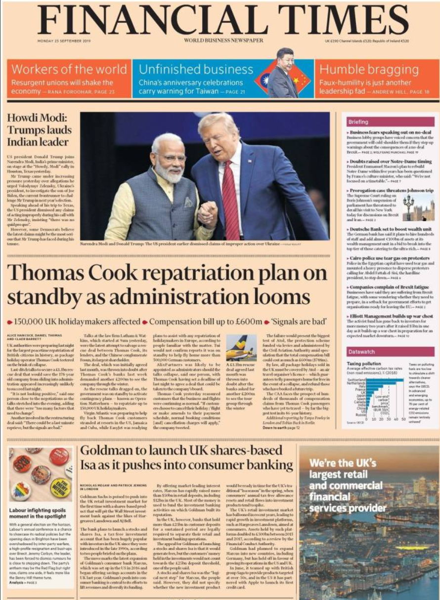 Financial Times: Nissan și Ghosn au încheiat un acord cu reglementatorii din SUA. Nissan va plăti 15 milioane de dolari, iar Ghosn un milion. ● Reproșurile amare cu privire la falimentul Thomas Cook ● Viaţă, soartă şi asaltul împotriva liberalismului ● Fonduri de urgenţă de 50 de milioane de euro în Turcia după falimentul companiei Thomas Cook. ● Le Nouvel Observateur Brexit: Ţările Uniunii Europene se pregătesc pentru o ieșire fără acord.