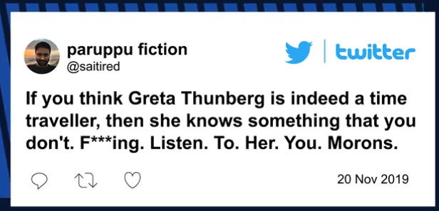 „Greta este o călătoare în timp, din viitor, și este aici ca să ne salveze”, a scris Jack. Iar altul a fost chiar mai dur (traducerea este aproximativă): „Dacă credeți că Greta Thunberg este într-adevăr o călătoare în timp, atunci ea știe ceva ce voi nu știți. La naiba, ascultați-o, nătărăilor”. (The New York Post)