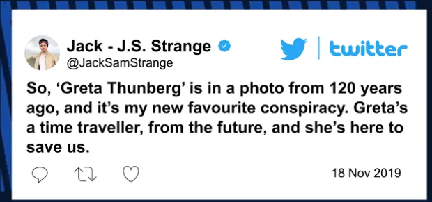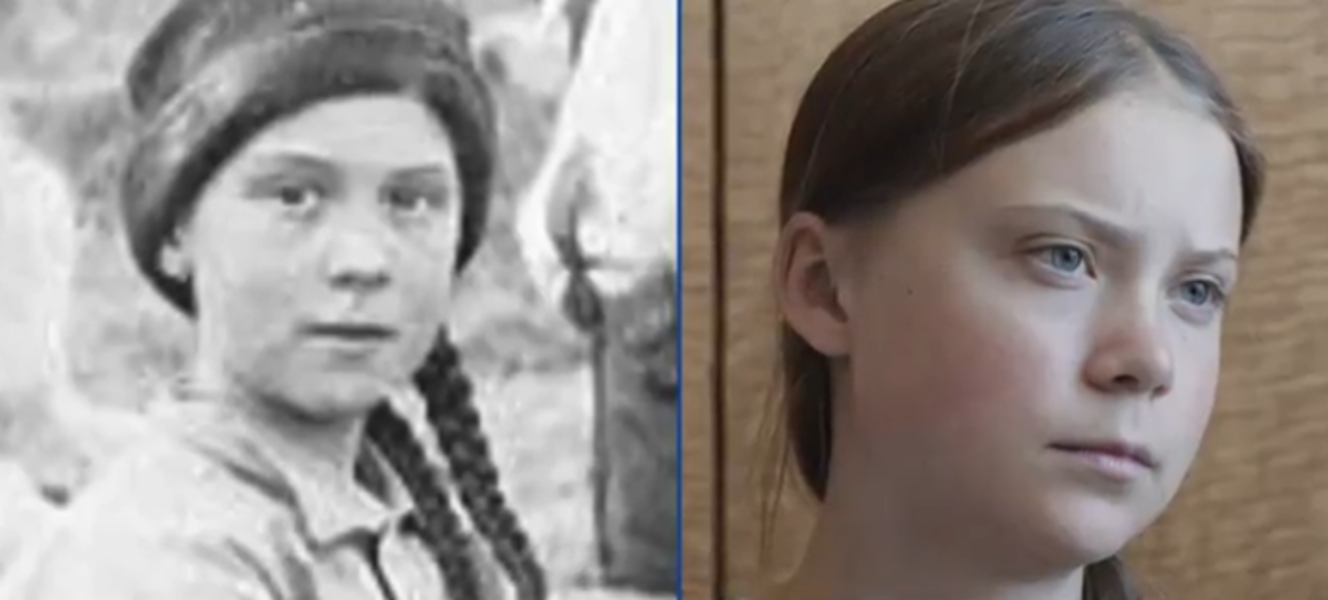 Adepții teoriei conspirației au fost stimulați de o fotografie veche de 120 de ani în care apare o fată care are o asemănare izbitoare cu Greta Thunberg, adolescenta activistă pentru mediu. Fotografia, descoperită în arhive ale universității din Washington, arată trei copii lucrând la o mină de aur din Canada, printre care o fată cu părul împletit în cozi identice și care afișează expresia stoică a lui Thunberg. Istoricii apreciază că a fost făcută în jurul anului 1898.