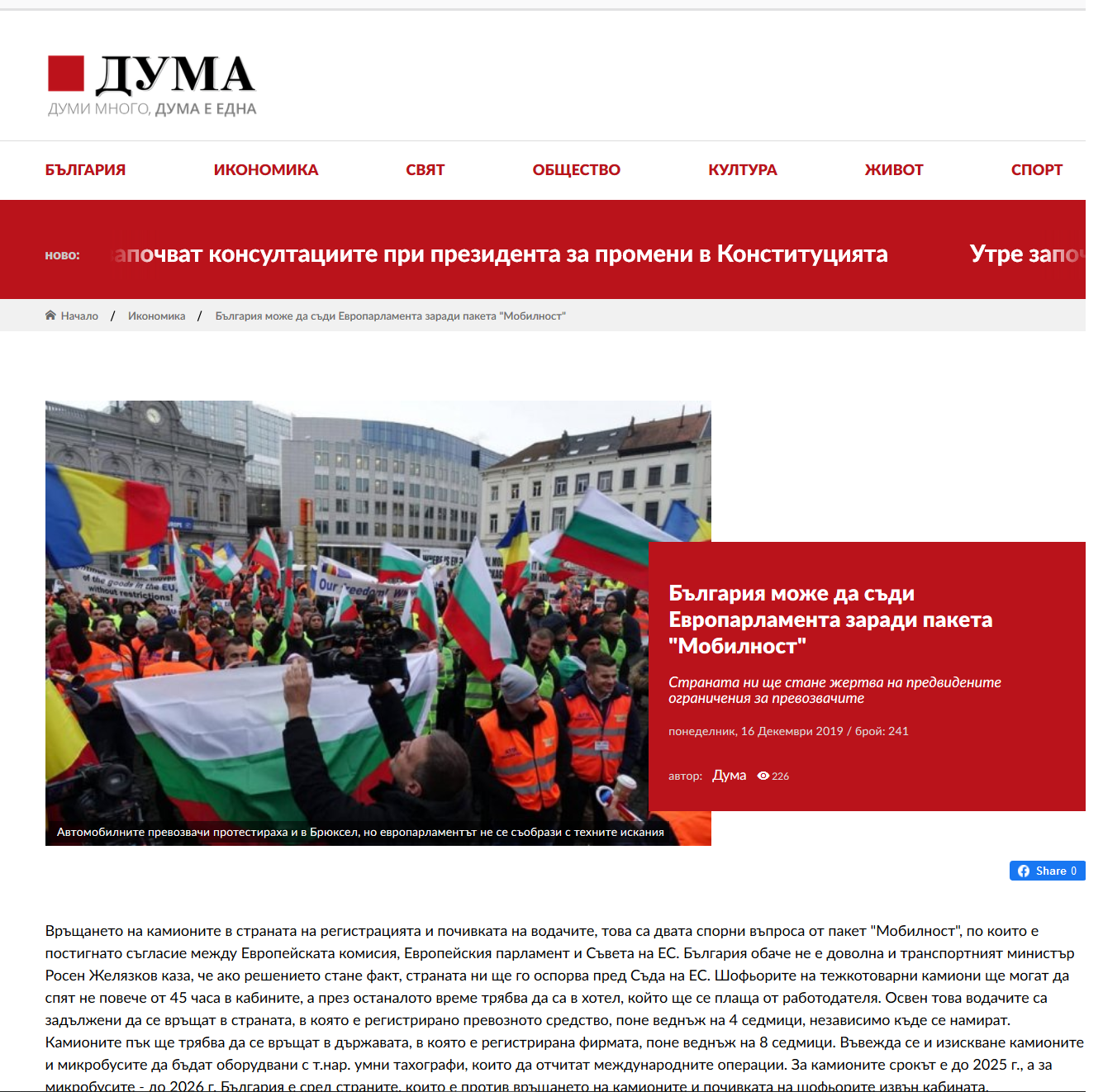Ministrul bulgar al transporturilor, Rosen Jeliazkov, a declarat că, atunci când modificările legislative ale Pachetului de Mobilitate vor deveni realitate, Bulgaria va intenta proces la Curtea de Justiție a UE. „Ne-am declarat clar intenția de a solicita arbitrajul instanței, deoarece măsurile propuse sunt disproporționate”, a spus Jeliazkov după întâlnirea cu reprezentanți ai transportatorilor internaționali, Mă surprinde ceea ce au făcut Comisia pentru Transport și Parlamentul European, pentru că s-au lua unele decizii, dar restricțiile rămân pentru noi.