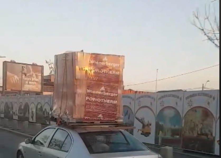O filmare care arată o mașină transportând un europalet cu cărămidă prins în chingi pe un portbagaj improvizat pe plafonul autovehiculului a devenit virală pe Facebook. ”Bă, ești nebun la cap?! Ca-n India! La prima frână îi cade ăla de acolo”, comentează cei care au filmat scena pe una din străzile din București.