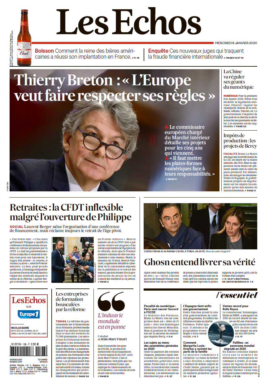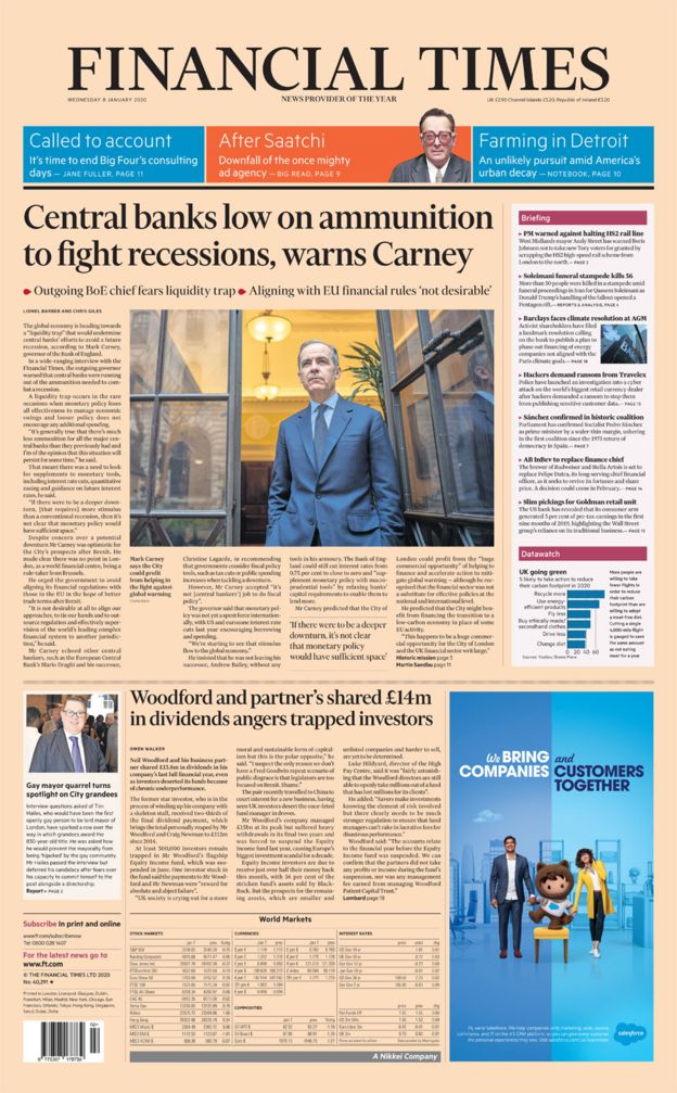 Financial Times: Băncile centrale rămân fără muniție în bătălia împotriva recesiunilor, avertizează guvernatorul Carney. Economia mondială se îndreaptă spre o „capcană a lichidității” care ar putea submina eforturile băncilor centrale de a evita o recesiune viitoare, potrivit lui Mark Carney, guvernatorul Băncii Angliei. ● Les Echos: Ghosn își va spune miercuri partea sa de adevăr. După ce a profitat de primele sale 48 de ore de „libertate” în care s-a bucurat de revederea soției și a apropiaților săi, Ghosn s-a pus rapid pe muncă pentru a pregăti marea conferință de presă programată pentru miercuri după-amiază în capitala libaneză. ● Duma: 34% dintre bulgari nu au bani de încălzire