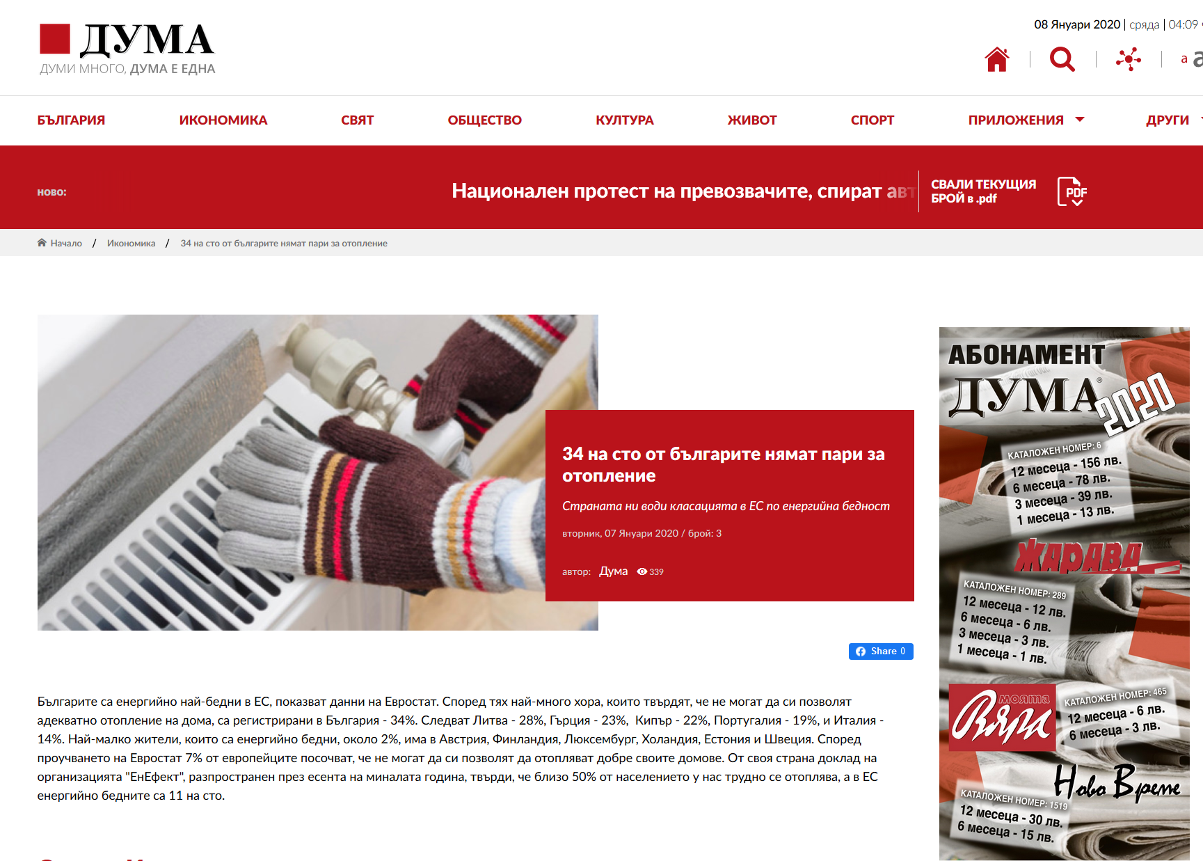 Potrivit unui sondaj Eurostat, 7% dintre europeni spun că nu își pot permite să-și încălzească bine casele. La rândul său, un raport al organizaţiei EnEffect, publicat toamna trecută, arată că aproape 50% din populația din Bulgaria stă prost la capitolul încălzire, iar în UE săracii din punct de vedere energetic sunt în procent de 11%. (RADOR)