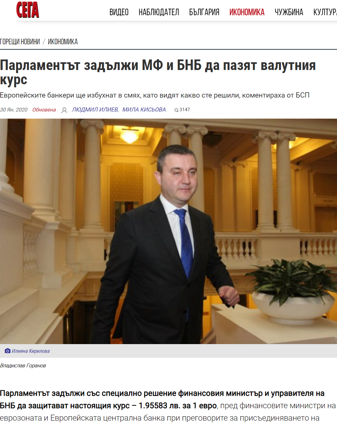 Bulgaria va adera la zona euro cu cursul actual de schimb – 1.95583 de leva pentru 1 euro – sau nu va adera deloc, ne-a asigurat ministrul bulgar de finanțe, Vladislav Goranov, după discuțiile cu forțele politice reprezentate în Parlament. Cu o săptămână în urmă, guvernanţii au modificat în secret amendamentul la Legea privind Banca Naţională a Bulgariei (BNB), ceea ce a ridicat temeri privind devieri ale cursului de schimb leva-euro şi ar putea duce la o devalorizare a economiilor oamenilor în momentul aderării ţării în zona euro.