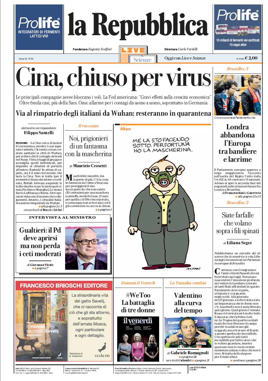- O altă temă de intensă preocupare în ultimele zile, epidemia cu noul coronavirus se menţine în atenţia presei internaţionale. Din China, agenţia de presă Xinhua relatează că universitatea cea mai prestigioasă a ţării, Tsinghua, este pe punctul de a obţine un vaccin împotriva coronavirusului. Pentru a bloca răspândirea infecţiei, „Rusia îşi închide frontiera cu China”, relatează Financial Times. Ziarele din Italia dau detalii despre nava de croazieră blocată în portul Civitavecchia pe baza suspiciunii că doi din pasagerii vasului ar fi infectaţi, însă agenţia italiană Ansa relatează că primele teste exclud prezenţa coronavirusului la bordul navei cu aproximativ 6.000 de turişti, care făcuse escale la Marsilia, Barcelona şi Palma de Mallorca. Din Franţa, Liberation scrie că Air France îşi suspendă cursele aeriene spre China până în 9 februarie şi că în general „ţările se zbat să-şi protejeze cetăţenii, sporind filtrele”, după cum constată USA Today, în vreme ce New York Times este de părere că „lumea plăteşte preţul dictaturii din China”. Este în orice caz „un test delicat pentru atotputernicul partid comunist chinez”, estimează Le Soir şi punctează că „între cenzură, propagandă şi capacitate puternică de acţiune, partidul ştie că trebuie să-şi păstreze încrederea populaţiei”. Totuşi, după cum scrie Financial Times, deşi „noile virusuri sunt o ameninţare, experţii previzionează că vechiul duşman reprezentat de gripă va fi cel mai mortal”.