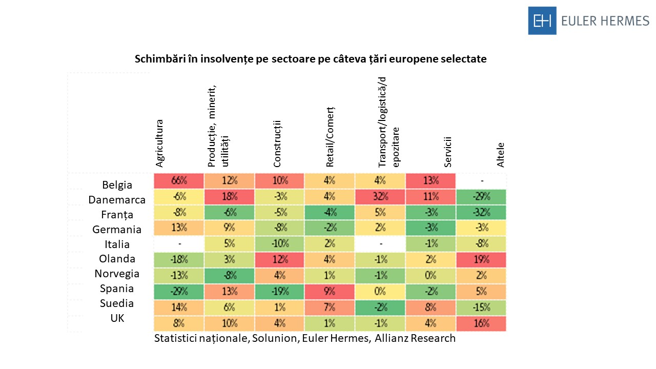 ”Ne așteptăm ca panta descendentă a insolvențelor din ultimii doi ani să-și modifice sensul. Încetinirea creșterii economice și accentuarea dezechilibrelor la nivelul deficitului de cont curent și al celui bugetar reprezintă motive de îngrijorare la nivel macroeconomic. De asemenea, vedem o creștere a numărului de incidente de neplată, coroborată cu o creștere a termenelor de încasare raportată ori confirmată de companii. Cele mai afectate sectoare sunt cel farmaceutic, distribuție cu precădere non-alimentar, construcții și sectoarele aferente”, spune Mihai Alexandru Chipirliu, Head of Risk Analysis, Euler Hermes România.