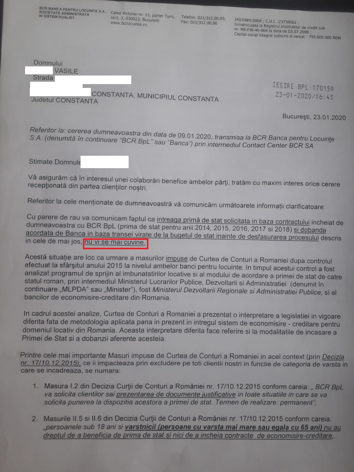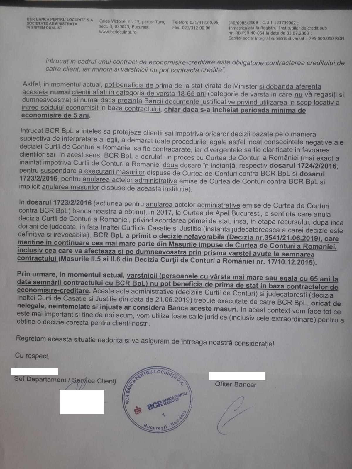 • Am semnat contractul în 2014, pentru mine și fiică – minoră la acea data, dar majoră la împlinirea termenului de economisire. În anul 2019 după economisirea de 5 ani, dorind să iau banii, mi s-a comunicat că trebuie să dovedesc că sunt în construcție, și chiar sunt. Nu înțeleg de ce în momentul calculării sumelor anuale care trebuiau depuse mi s-a comunicat de către funcționara băncii că trebuie să depun anual 4500 de lei, sumă contractată fiind de 55.000 lei, încât la implinirea termenului am aflat de la bancă că mai trebuie să depun încă 4500 de lei și în 2020. Pentru fiică mea, acum majoră, nu se mai acordă primele de la stat și nici credit în condițiile contractului încheiat în 2014. Am reziliat contractul însă doresc să revendic plata primelor anuale cuvenite și posibilitatea acordării unui credit în condițiile contractului. În aceste condiții, sunt de acord să mă alătur grupului constituit pentru o acțiune în justiție (alt client bancar)