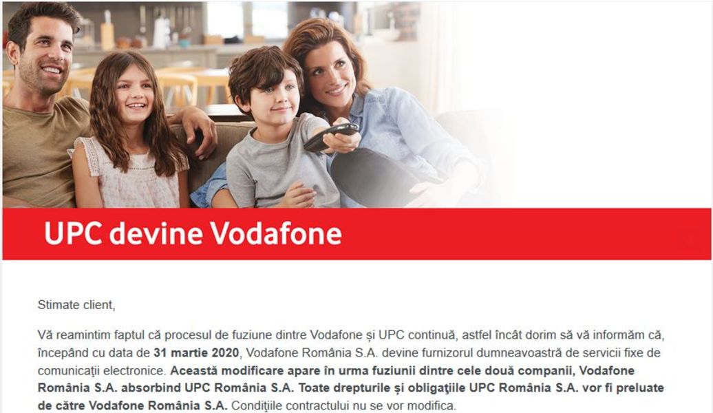 Vă reamintim faptul că procesul de fuziune dintre Vodafone și UPC continuă, astfel încât dorim să vă informăm că, începând cu data de 31 martie 2020, Vodafone România S.A. devine furnizorul dumneavoastră de servicii fixe de comunicaţii electronice. Această modificare apare în urma fuziunii dintre cele două companii, Vodafone România S.A. absorbind UPC România S.A. Toate drepturile și obligaţiile UPC România S.A. vor fi preluate de către Vodafone România S.A. Condiţiile contractului nu se vor modifica.