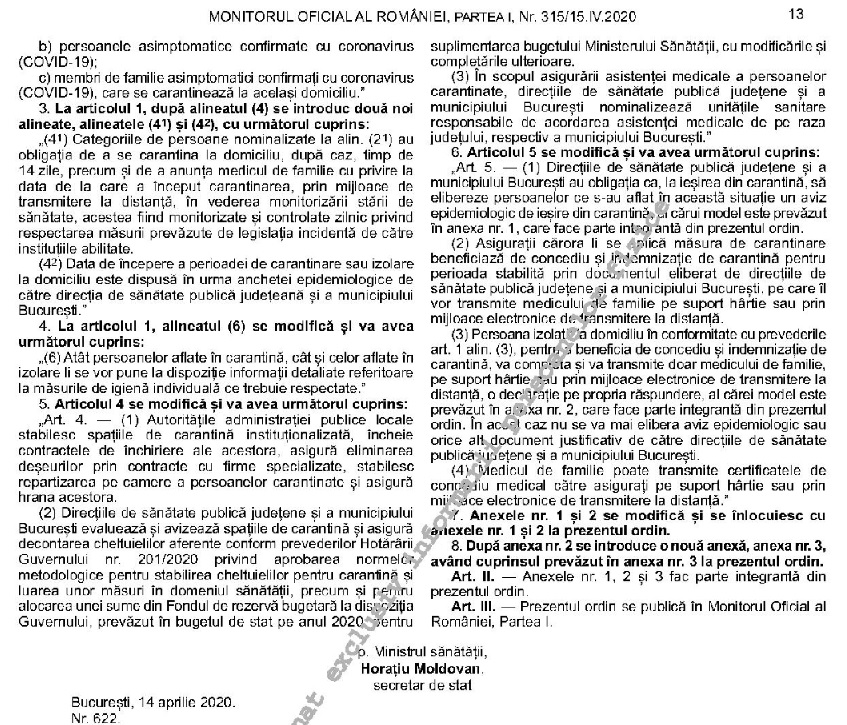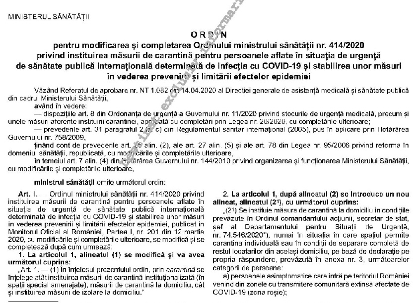 Ordinul Ministerului Sănătății publicat astăzi în Monitorul Oficial modifică Ordinul nr. 414/2020 privind instituirea măsurii de carantină pentru persoanele aflate în situaţia de urgenţă de sănătate publică internaţională determinată de infecţia cu COVID-19. Ordinul este semnat de medicul Horațiu Moldovan, secretar de stat în Ministerul.