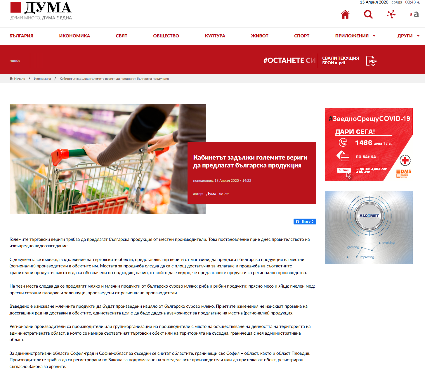 Marile lanțuri de magazine trebuie să ofere produse bulgărești, de la producătorii autohtoni, potrivit unei decizii a guvernului bulgar, adoptate în cadrul unei ședințe video extraordinare.