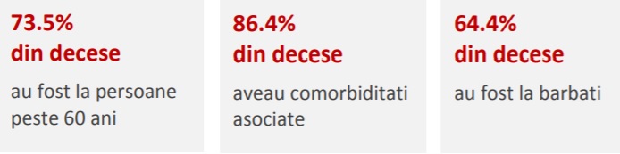 - 73,5% dintre decese au fost la persoane peste 60 ani și 64,4% dintre decese au fost în rândul bărbaților.