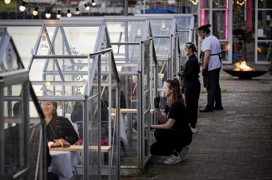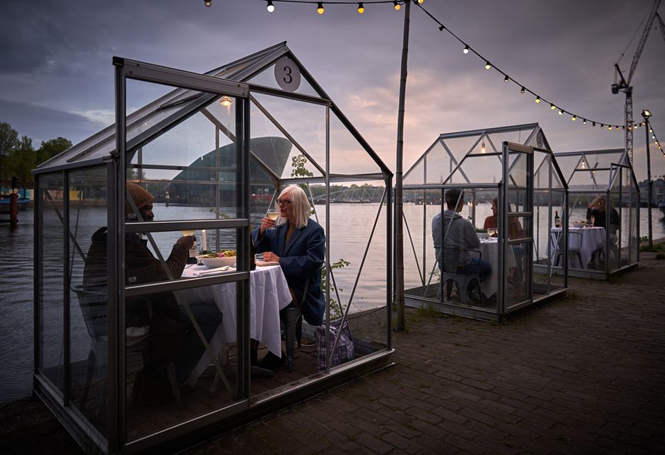 Mediamatic ETEN, un restaurant vegan al centrului de arte Mediamatic Biotoop, a amplasat sere pentru a testa dacă poți mânca în oraș în același timp respectând regulile de distanțare socială.