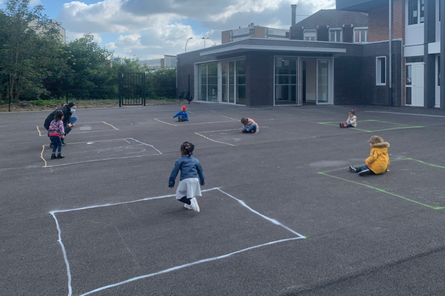 Publicată marți pe Twitter, de către jurnalistul Lionel Top, imaginea arată cum fiecare copil stă în câte un pătrat în curtea unei grădinițe din Tourcoing, pentru respectarea distanței fizice din cauza pandemiei.