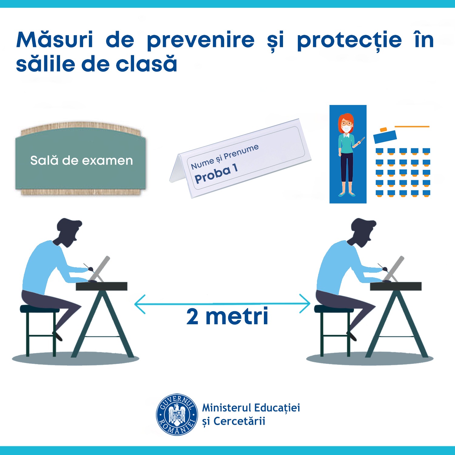 • În sălile de clasă activitățile/examenele se vor desfășura prin stabilirea locurilor astfel încât să existe o distanță între elevi/candidați, pe rânduri și între rânduri, de 2 m unul față de altul