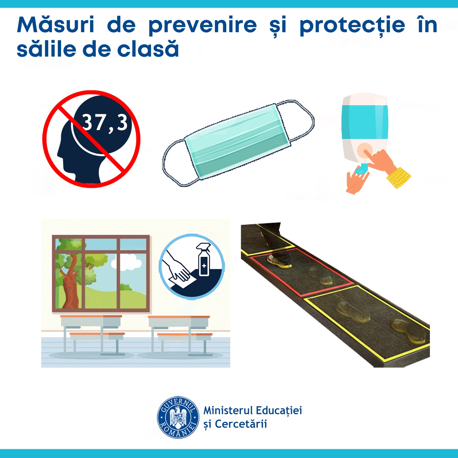• la intrarea în unitatea de învățământ a personalului didactic, didactic auxiliar, nedidactic și a elevilor va fi măsurată temperatura (care nu va trebui să depășească 37,3 grade Celsius) de cadrul medical care va asigura asistența medicală pe întreaga durată de desfășurare a activității;
