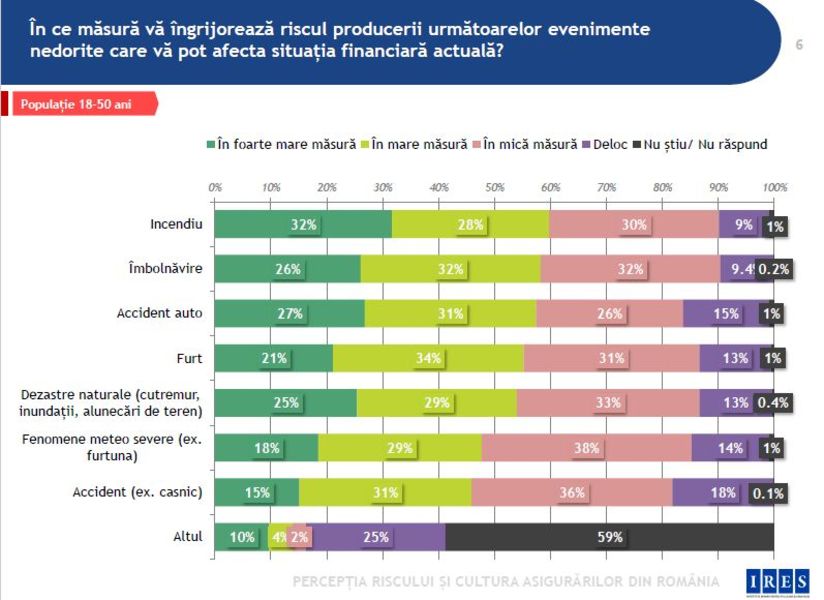 Incendiul și riscurile asociate acestuia continuă să constituie principala preocupare a celor cu vârsta între 18 și 50 de ani, în relație cu situația lor financiară, însă în scădere față de anul trecut – 60% în 2020, față de 73% în 2019. În acest interval de timp, îmbolnăvirea a devenit al doilea cel mai indicat risc, un factor posibil care a favorizat creșterea fiind epidemia de COVID-19, astfel încât 58% dintre români se declară preocupați de acest aspect, la egalitate cu accidentele auto. Furturile sunt, de asemenea, considerate un risc semnificativ de către 55% dintre respondenți, urmate îndeaproape de către dezastrele naturale (54%).