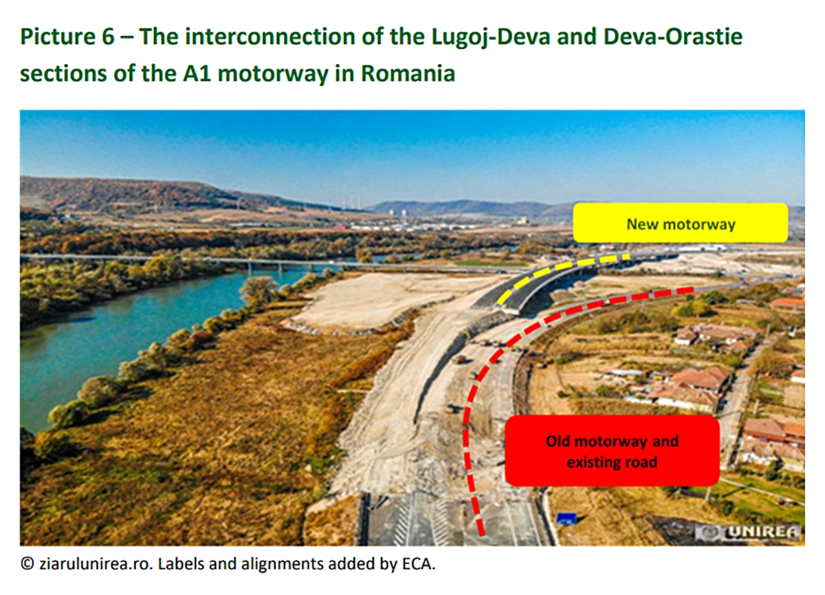 „ (…) între Lugoj și Deva, o porțiune completă a autostrăzii A1, co-finanțată cu 12,4 milioane de euro din bani UE, nu este utilizată în prezent. În apropiere de Deva, două tronsoane de drum, construite într-un interval de doar șapte ani între ele, au fost conectate greșit. Drept urmare, au trebuit demolați 800 de metri de autostradă deja construită pentru a reconstrui corect conexiunea. În plus față de partea care trebuia reconstruită (estimată la 3,2 milioane euro de cofinanțare a UE), lucrările de demolare au costat 0,9 milioane euro, din care UE a cofinanțat 0,5 milioane euro. 3.7 milioane de euro din banii UE cheltuiți în acest fel pot fi considerați irosiți”, susțin autorii raportului.