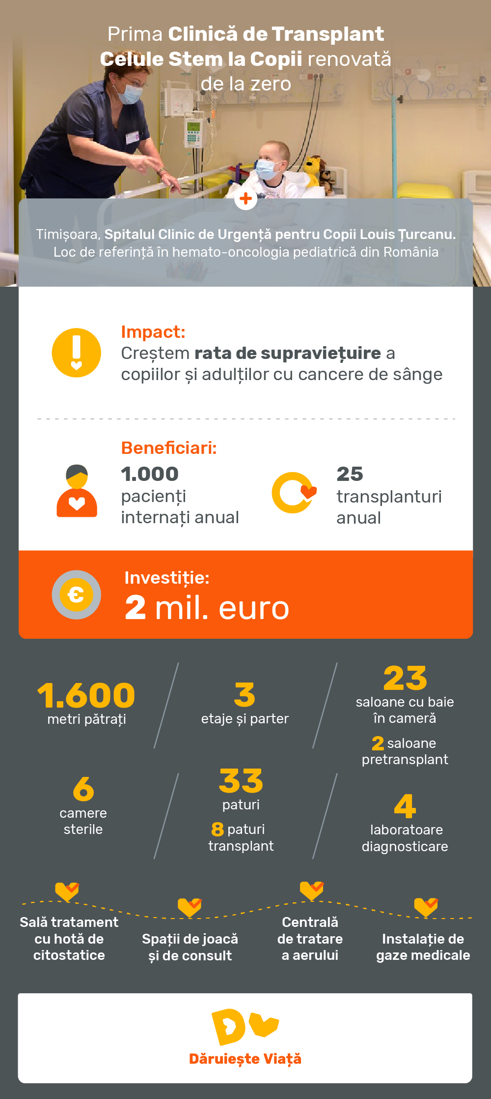 Clinica de Oncologie și Hemato-Oncologie Pediatrică de la Spitalul de Copii Louis Țurcanu din Timișoara, unde a avut loc primul transplant de celule stem la copii din România, a fost renovată, recompartimentată și modernizată complet de Asociația Dăruiește Viață, în urma unei investiții de aproximativ 2 milioane de euro, bani proveniți exclusiv din donații și sponsorizări. Clinica din Timișoara este un reper pentru hemato-oncologia pediatrică, fiind locul în care s-a realizat, în 2001, primul transplant de celule stem la un copil din România. Unitatea medicală, fondată de Prof. Dr. Margit Șerban cu donații din partea ONG-uri externe, are anual aproximativ 1.000 de copii internați și o medie de 20-25 transplanturi.