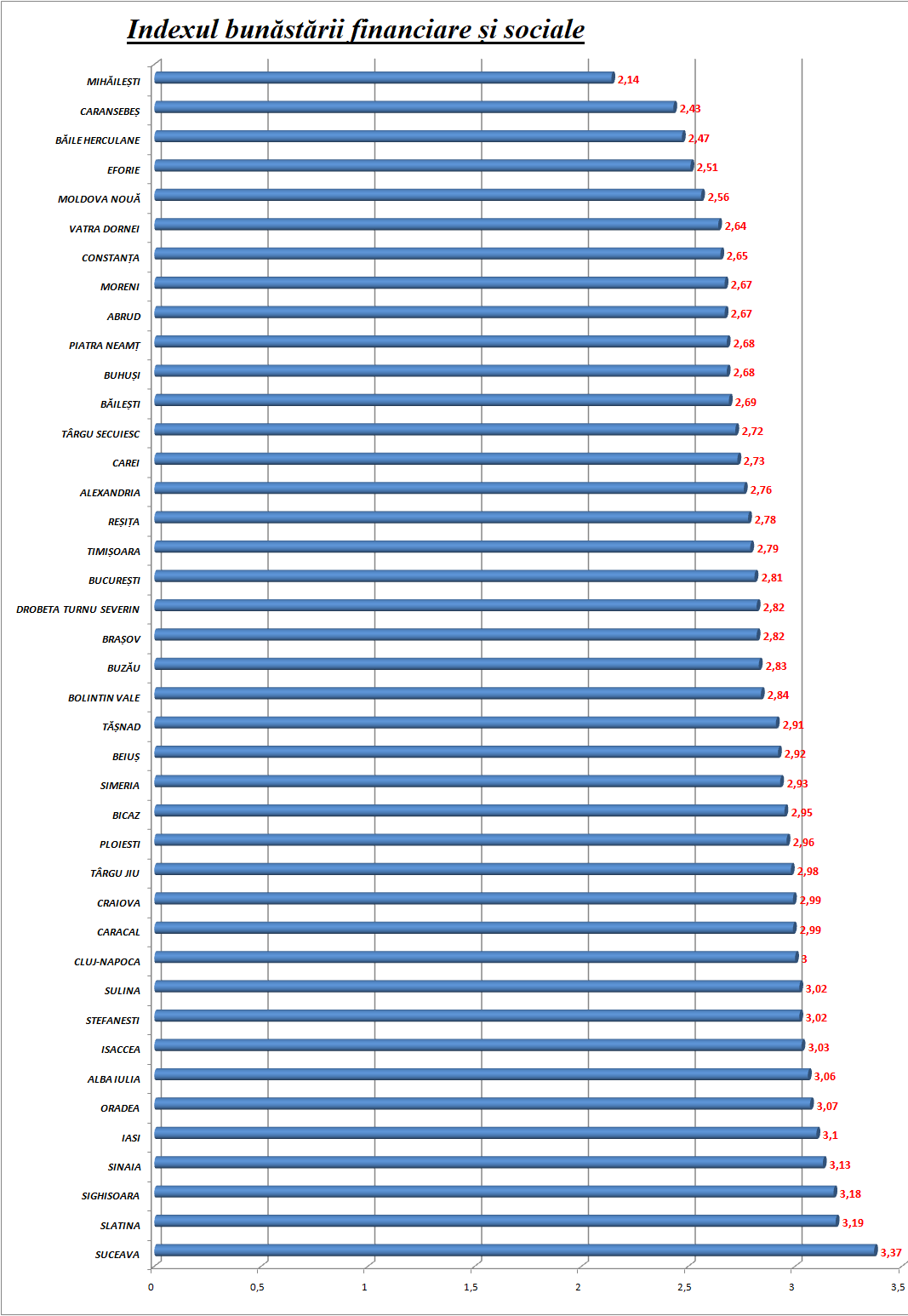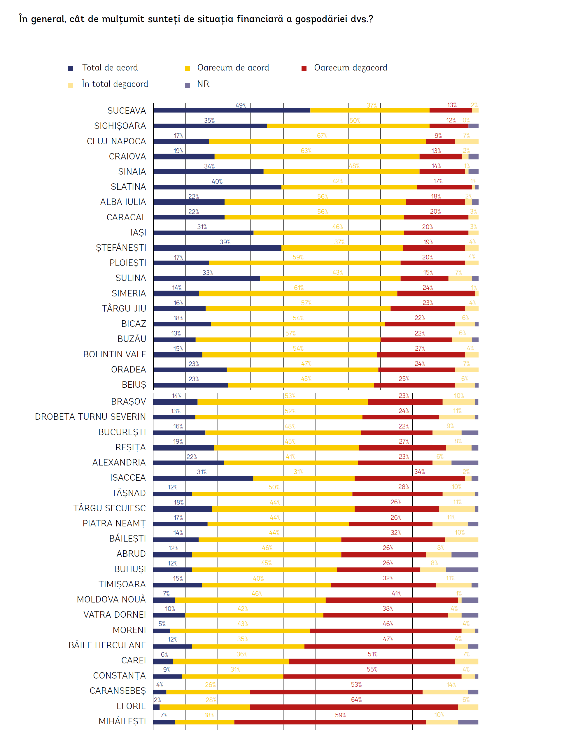 Napoca, Craiova și Slatina, iar trei orașe valori sub 30%: Caransebeș, Eforie și Mihăilești. Cele mai scăzute valori de mulțumire față de situația financiară a gospodăriei au fost înregistrate în Sud-Est (54%) și Vest (54%).