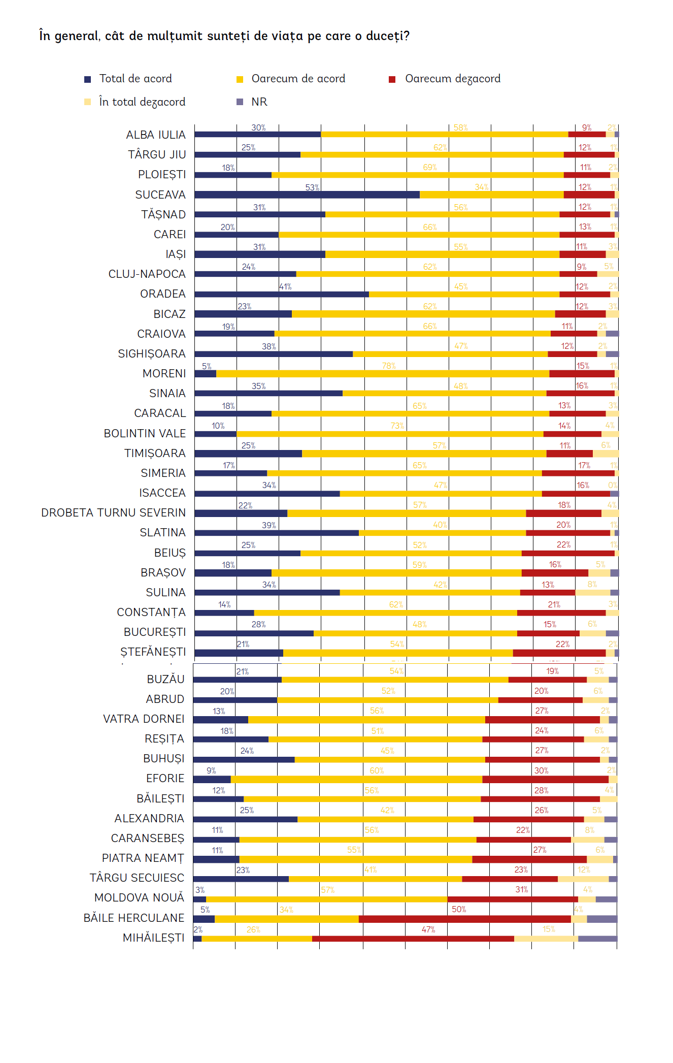 - 78% din populația urbană se declară mulțumită sau foarte mulțumită la întrebarea: „Cât de mulțumiți vă considerați, în general, cu viața pe care o duceți?”.