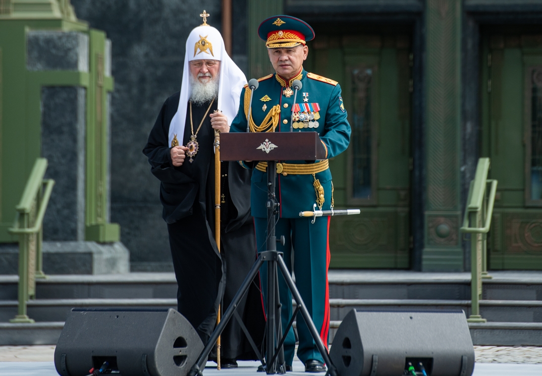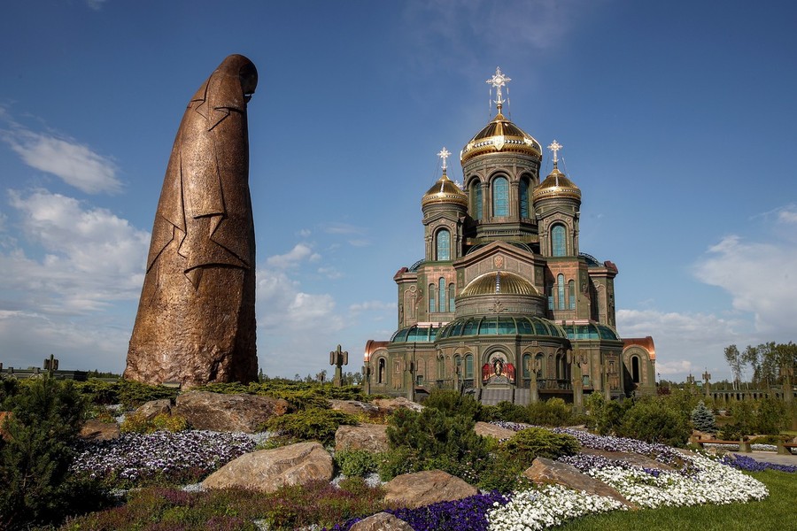 Îngeri veghează deasupra artileriei, imagini religioase sunt împodobite cu Kalașnikovuri iar icoana Fecioarei Maria amintește de un afiș din al Doilea Război Mondial. Imaginile din interiorul vastei Catedrale a Forțelor Armate ruse amestecă militarismul, patriotismul și creștinismul ortodox într-un mod extrem de controversat, scrie The Guardian.