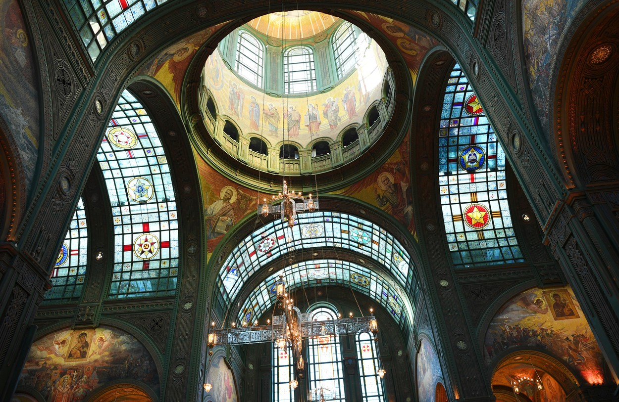 Înăuntru se află cea mai mare cantitate de mozaic din orice biserică din lume, multe din piesele decorative înfățișând bătălii din istoria Rusiei și al Doilea Război Mondial în mod special.