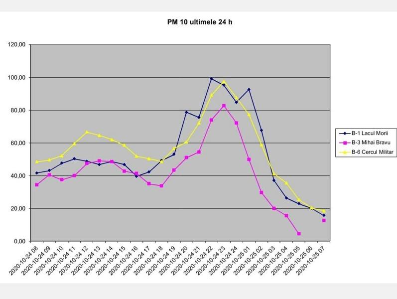 ”În ceea ce privește aglomerarea București-Ilfov, valoarea concentrațiilor de PM2,5 raportată la cea a PM10 (aprox 80%) indică existența unor procese de ardere desfășurate la începutul serii, creșterea concentrațiilor fiind favorizată de dispersia foarte slabă a poluanților (calm atmosferic aproape total instaurat de la ora 18:00). Nu au fost depășite valorile limită, cu excepția PM10, în cazul căruia concentrația medie zilnică a depășit valorile limită la stațiile B6 (60 micrograme/mc) și B1 (55 micrograme/mc). Aceste valori vor fi validate, ulterior, de măsurătorile realizate gravimetric, prin metoda de referință. Evoluția concentrațiilor (PM10, PM2,5 NO2, CO, benzen) și a indicatorilor meteo indică posibile cauze emisiile din traficul rutier acumulate pe parcursul zilei și încălzirea rezidențială cu lemne și alte tipuri de combustibil din zonele periurbane ale Bucureștiului. Deși emisiile de poluanți nu au fost semnificative, factorii meteo au influențat dispersia poluantilor și au condus la aceste creșteri față de zilele precedente”, au mai scris, pe Facebook, reprezentanții Ministerului Mediului.