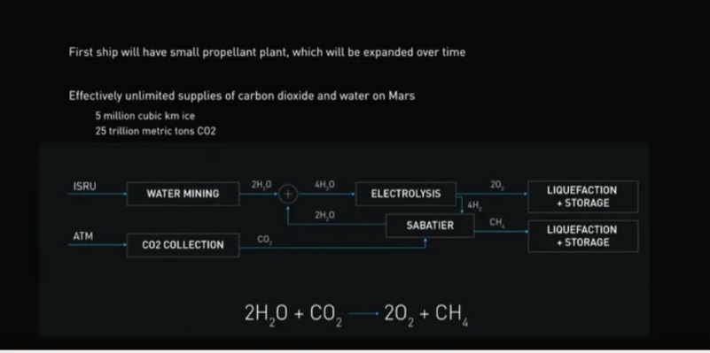 Musk însuși a descris în 2016 cum ar lucra o astfel de capacitate. Apa ar fi colectată din rezrvele de gheață ale planetei, estimate la 5 milioane de kilometri cubi. Dioxidul de carbon ar veni din atmosferă, estimarea fiind de 25 de trilioane de tone. Electroliza va descompune apa în oxigen și hidrogen, iar procesul Sabatier va folosi dioxidul de carbon și hidrogenul pentru a face metan și mai multă apă.