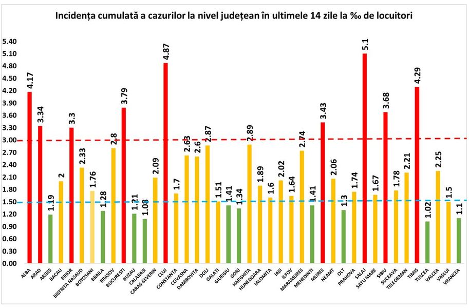 În București, rata de infectare pentru ultimele două săptămâni este de 3,79 la mie.
