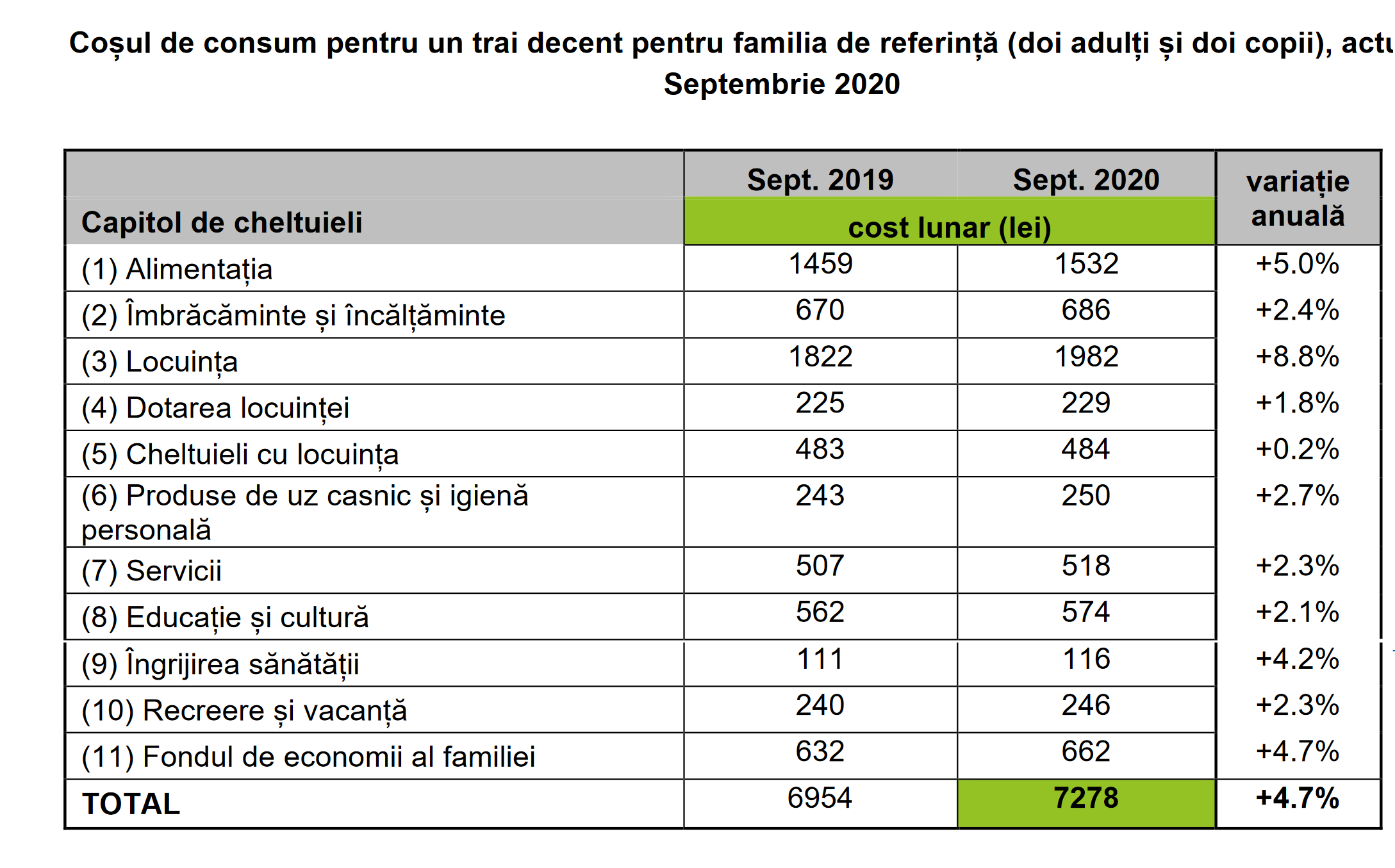 Valoarea coșului minim de consum pentru un trai decent pentru o familie de doi adulți și doi copii pentru luna Septembrie 2020 este de 7.278 lei pe lună, în creștere cu +4,7% față de anul trecut, arată datele publicate de Friedrich-Ebert Stiftung. În septembrie 2019, valoarea coșului minim de consum pentru un trai decent pentru același tip de gospodărie era de 6.954 lei pe lună, iar în septembrie 2018 -de 6.762 lei.