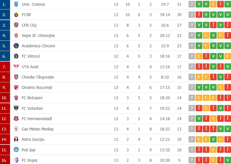 ​Formaţia CSU Craiova a învins, luni, în deplasare, cu scorul de 2-1, echipa UTA Arad, în ultimul meci al etapei a XIII-a a Ligii I. În urma acestui rezultat, Craiova ocupă locul 1 în Liga I, cu 31 de puncte, urmată de FCSB, cu 30 de puncte, şi de CFR Cluj, cu 27 de puncte.