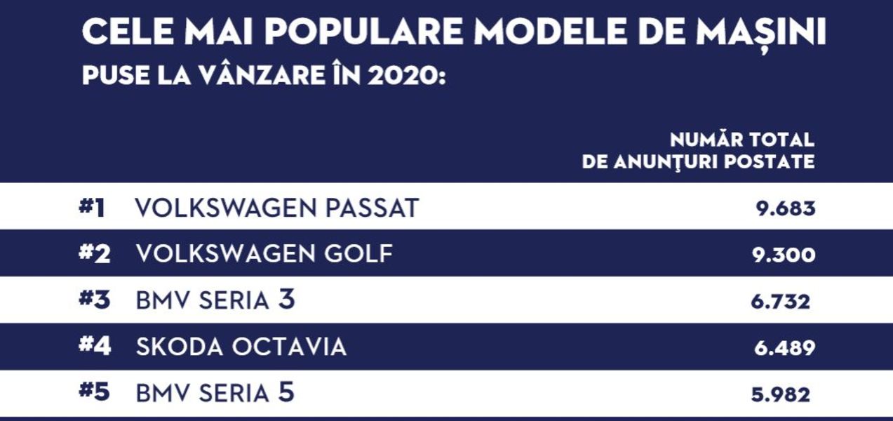 Passat și Golf de la Volkswagen au fost modelele cel mai des prezente în anunțuri, top cinci fiind completat de BMW Seria 3, Skoda Octavia și BMW Seria 5.