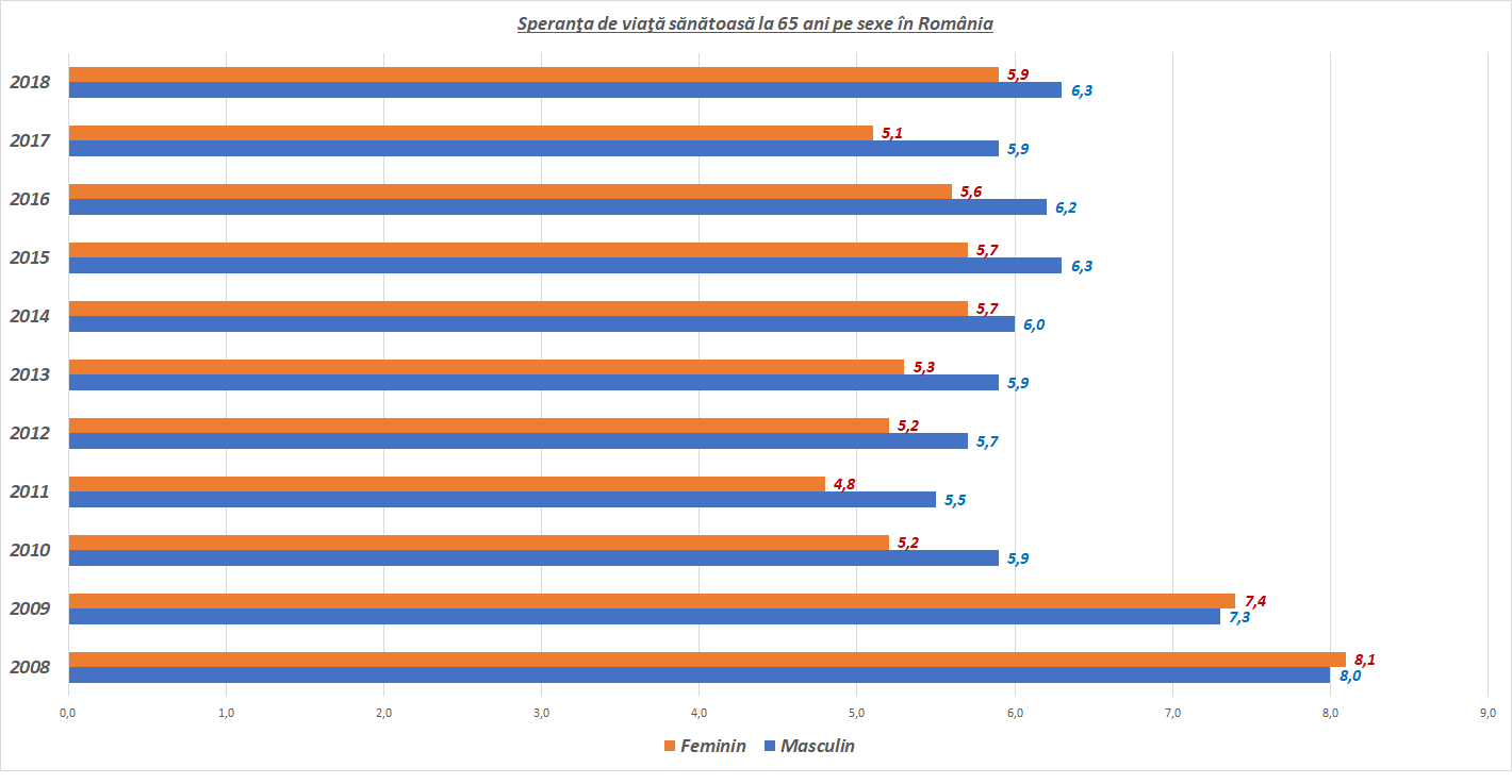 Populaţia României trăieşte mai mult în prezent, comparativ cu anul 2008, însă nu şi mai sănătos. Afirmația este valabilă pentru ambele sexe. În anul 2018 bărbaţii au o speranţă de viaţă sănatoasă mai mare decât cea a femeilor cu 0,4 ani, faţă de situaţia inversă înregistrată în anul 2008, când speranţa de viaţă sănătoasă a femeilor o depăşea pe cea a bărbaţilor cu 2,9 ani. Speranţa de viaţă sănătoasă la naştere pentru femei a fost de 59,6 ani (în anul 2018), faţă de 61,9 ani (în anul 2009), iar pentru bărbaţi de 59,2 ani (în anul 2018), faţă de 59,6 ani (în anul 2009). La nivelul UE, în anul 2018, ecartul dintre femei şi bărbaţi pentru speranța de viață sănătoasă la naștere este de 0,4 ani, în favoarea populaţiei feminine, pentru care speranţa de viaţă sănătoasă la naştere este de 59,6 ani.