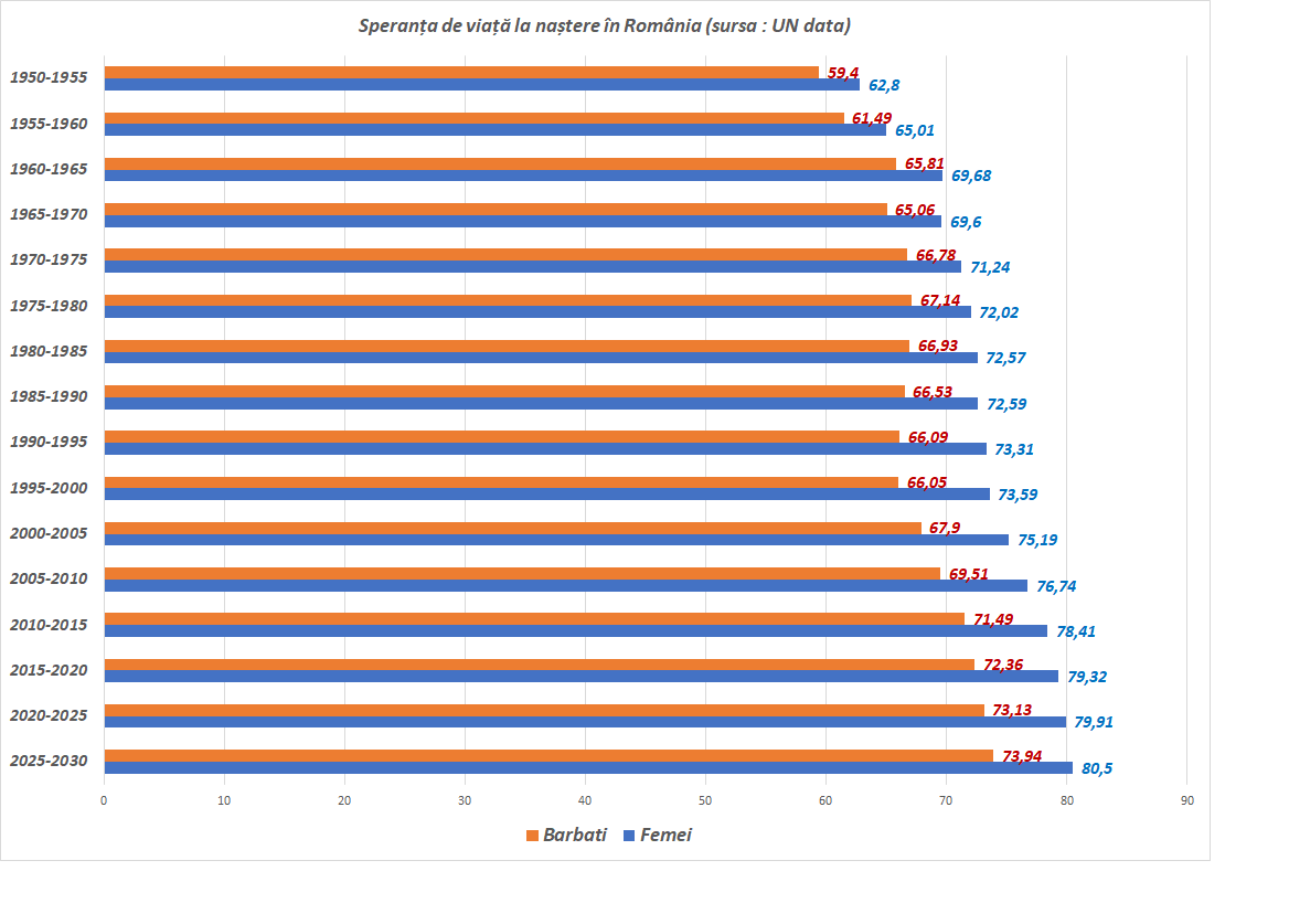 În România, speranţa de viaţă la naştere a fost în anul 2019 de 72,5 de ani pentru bărbaţi şi de 79,6 de ani pentru femei.