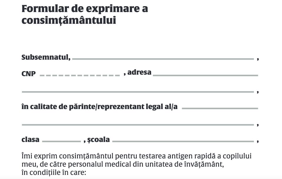 Îmi exprim consimțământul pentru testarea antigen rapidă a copiluluimeu, de către personalul medical din unitatea de învățământ,în condițiile în care:Prezintă simptome sugestive infecției COVID-19/a fost în contact cuDatele vor fi folosite de Direcțiile de Sănătate Publică în scopul înscrierii în baza de date Coronaforms. un coleg(ă) confirmat(ă) pozitiv COVID-19.- formularul se va completa cu majuscule- persoana care completează datele în prezentul formularîși asumă introducerea corectă a datelor.