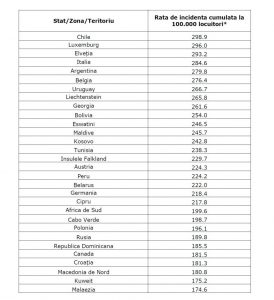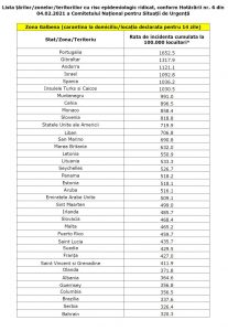 Art.1 – Se aprobă lista țărilor/zonelor/teritoriilor cu risc epidemiologic ridicat pentru care se instituie măsura carantinei asupra persoanelor care sosesc în România din acestea, prevăzută în anexa nr. 1. Art.2 – (1) La intrarea în România, persoanele care sosesc din țările/zonele/teritoriile cu risc epidemiologic ridicat prevăzute la art. 1, au obligația prezentării certificatului unui test negativ RT-PCR pentru SARS-CoV-2, efectuat cu cel mult 72 de ore înainte de data intrării în țară.