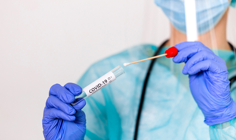 Lab technician holding swab collection kit,Coronavirus COVID-19 specimen collecting equipment,DNA nasal and oral swabbing for PCR polymerase chain reaction laboratory testing procedure and shipping