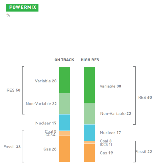 După cum se poate observa din graficul din figură, mixul energetic va implica un procent important de energie produsă din combustibili fosili în anul 2030 (33% pentru prima țintă, 22% pentru ce-a de-a doua țintă, mai ambițioasă). În ambele scenarii, în 2030 energia produsă din surse nucleare va rămâne ca proporție în jurul a 17%.