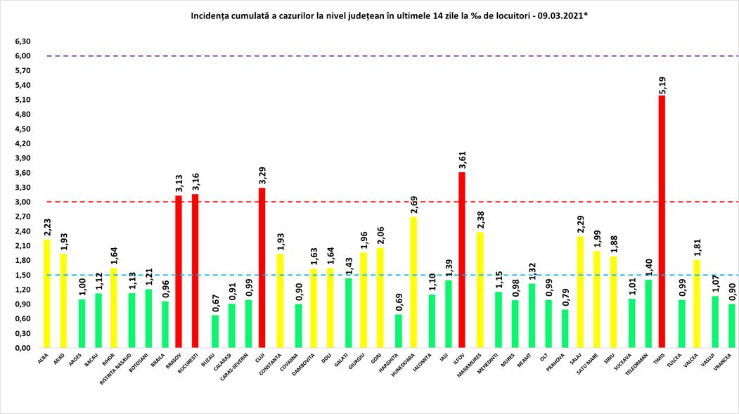 Timiș rămâne marți pe primul loc în topul infectărilor, cu o incidență a cazurilor de COVID-19 la mia de locuitori de 5,19, în ușoară scădere însă față de ziua precedentă când indicele era de 5,43. În zona roșie rămân Ilfov, cu 3,61, Cluj, cu 3,29 în scădere de la 3,39, și Brașov cu 3,13 în scădere față de 3,24.