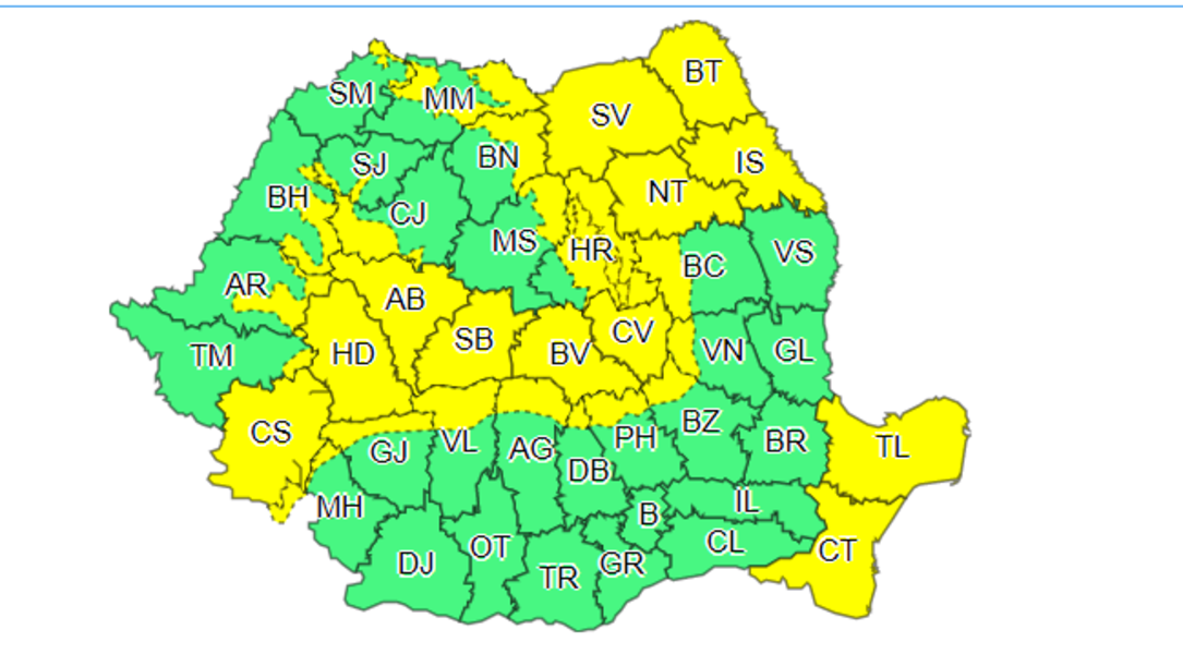 A doua avertizare cod galben intră în vigoare luni, 15 martie, la ora 14:00 şi este valabilă până miercuri, 17 martie, ora 20:00.