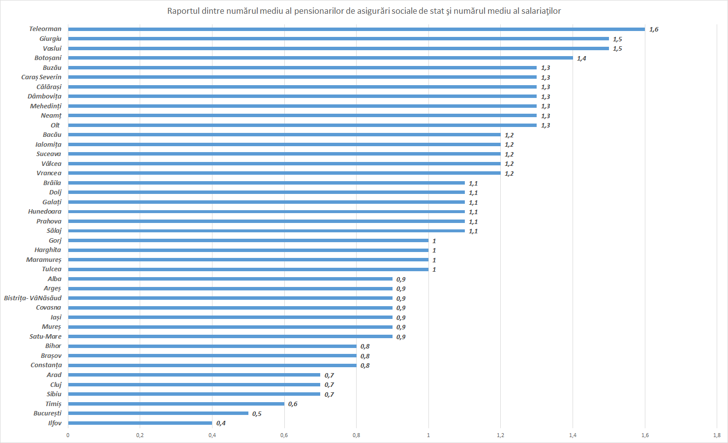 Situația diferă de la județ la județ în privința numărului de salariați și a pensionarilor susținuți de aceștia. În medie, la nivelul țării avem 10 salariați care susțin 9 pensionari. Acelaşi nivel al raportului s-a înregistrat în 7 dintre judeţele ţării (Alba, Argeṣ, Bistriṭa-Năsăud, Covasna, Iaṣi, Mureṣ ṣi Satu-Mare) şi a fost inferior în 9 judeţe, cel mai mic raport (4 la 10) înregistrându-se în judeṭul Ilfov. În celelalte 26 de judeţe, nivelul raportului s-a situat peste media pe ţară, cea mai mare valoare fiind atinsă în judeţul Teleorman (16pensionari la 10 salariați), urmat de judeṭele Giurgiu ṣi Vaslui (15 la 10) ṣi judeṭul Botoṣani (14 la 10), potrivit datelor INS.