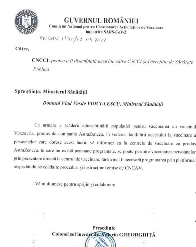 ​Vaccinarea cu vaccinul împotriva COVID-19 produs de AstraZeneca se va face direct prin prezentarea la centrul de vaccinare, fără programare prealabilă, arată un document semnat de coordonatorul campaniei de vaccinare, medicul Valeriu Gheorghiță, și adresat ministrului Sănătății și Direcțiilor de Sănătate Publică, document obținut de HotNews.ro.