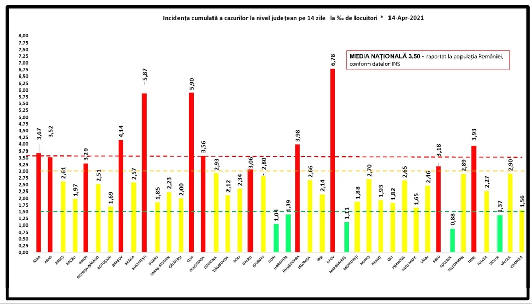 Ca și luni, Capitala și 11 județe sunt în zona roșie, cu o incidență la mia de locuitori de peste 3, iar 5 județe sunt în zona verde, cu o rată de infectare sub 1,5.