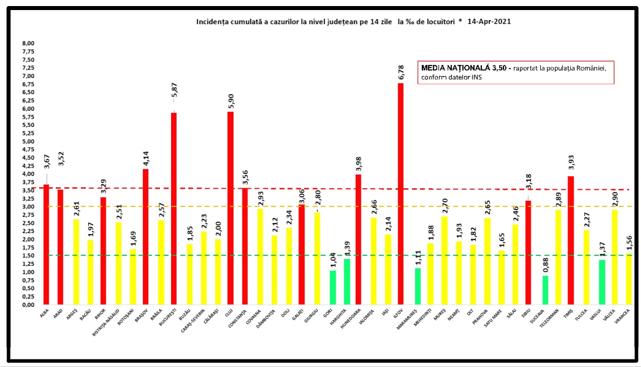 Ca și luni, Capitala și 11 județe sunt în zona roșie, cu o incidență la mia de locuitori de peste 3, iar 5 județe sunt în zona verde, cu o rată de infectare sub 1,5.