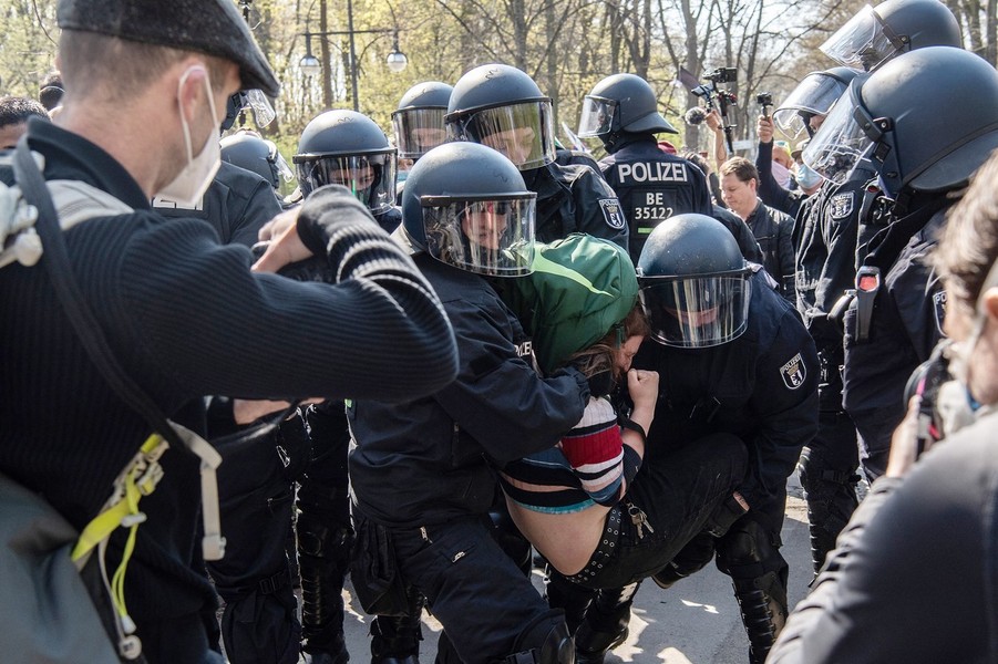 Dubele poliției sunt parcate în apropierea Porții Brandenburg și forțele de ordine monitorizează manifestația.