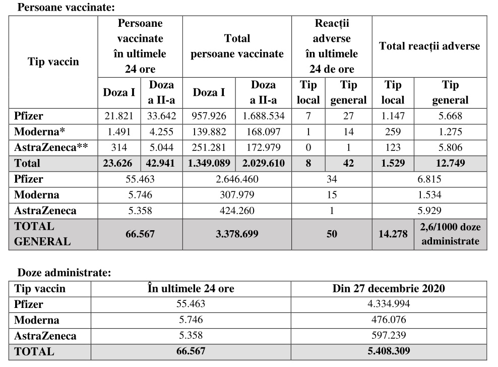 Peste 66.000 de persoane au fost vaccinate în ultimele 24 de ore anti-Covid în România, dintre care 55.463 au fost imunizate cu Pfizer, 5.746 cu Moderna și 5.538 cu AstraZeneca a anunțat Comitetul Naţional pentru Coordonarea Vaccinării anti-COVID. În total, de la debutul campaniei de vaccinare, peste 2,3 milioane de persoane au fost inoculate cu unul dintre vaccinuri, dintre care peste 2 milioane au primit ambele doze necesare, în total administrându-se aproape 5,4 milioane de doze de vaccin.