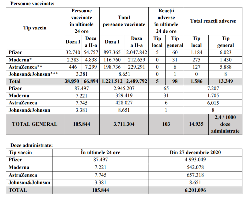 Un număr de 105.844 de persoane s-au vaccinat în ultimele 24 de ore, dintre care doar 38.950 cu prima doză. Numărul personelor imunizate a ajuns la 3.711.304, dintre care 2.489.792 cu ambele doze.