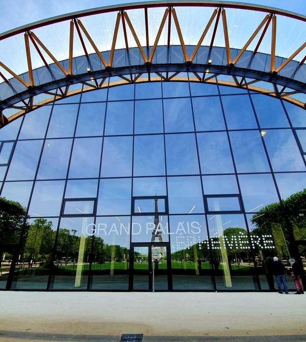 Grand Palais Éphémère, clădire din lemn şi sticlă care înlocuieşte pentru câţiva ani Grand Palais aflat în lucrări de consolidare, a fost ridicată în faţa Turnului Eiffel din Franţa. Are zece mii de metri pătrați și a fost realizat în timpul pandemiei.