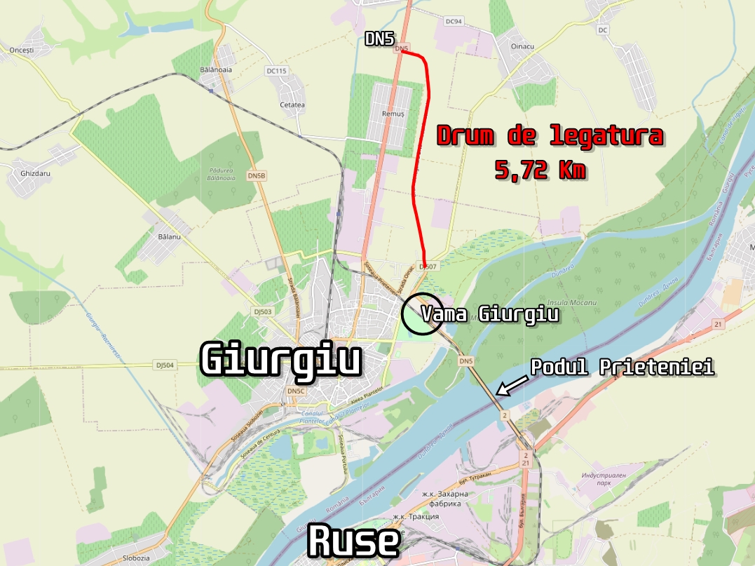Drumul de legătură se desprinde din DN 5, la km 56+197, printr-o intersecție giratorie și se continuă spre sud, intersectându-se cu DN 5 și DJ 507, printr-un alt sens giratoriu la km 62+404. Drumul ajunge în sensul giratoriu de la punctul vamal prin Strada Unirii, aceasta urmând a fi reabilitată la 2 benzi pe sens, cu aceeași structură ca a variantei ocolitoare.