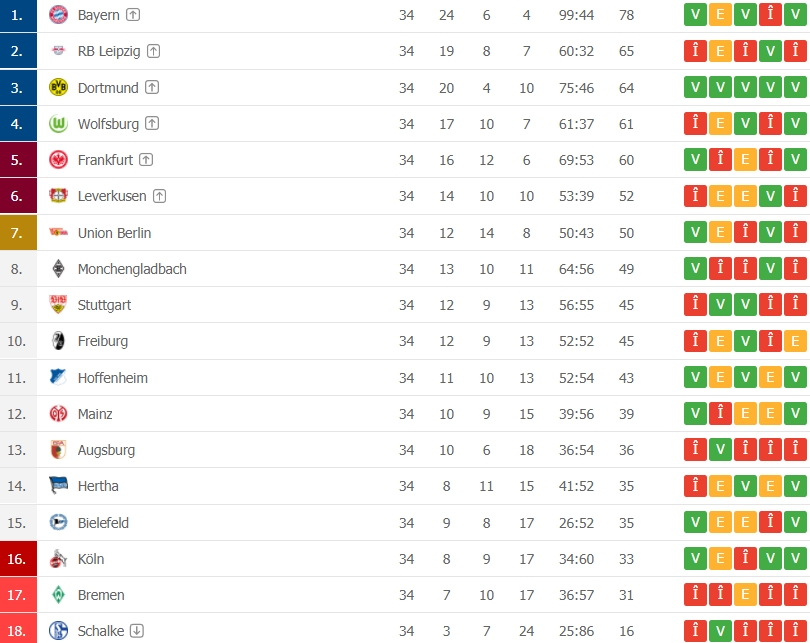 • Werder Bremen și Schalke 04 au retrogradat în Zweite Bundesliga, în timp ce FC Koln va juca un baraj de menținere cu ocupanta locului al treilea din liga secundă.